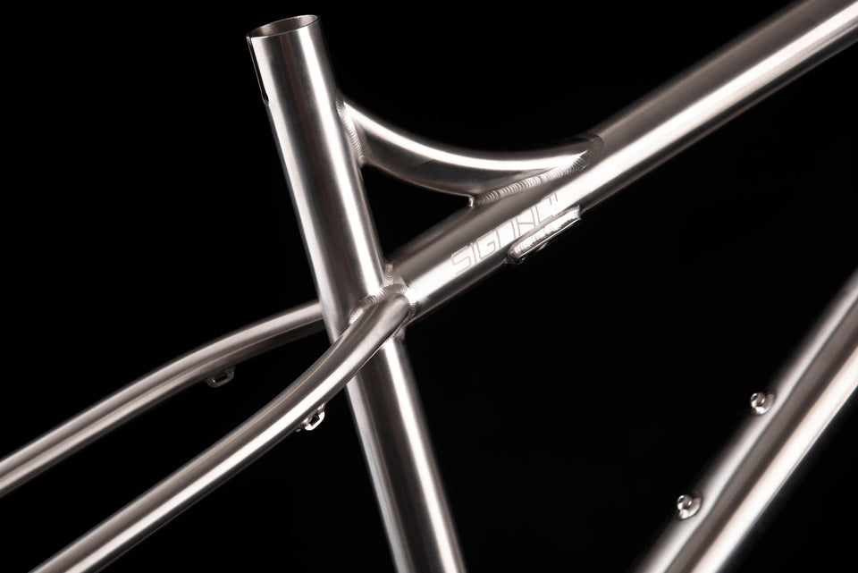 The titanium Signal frame is stiff, light and durable. 3Al 2.5V Aeronautical grade titanium tubing softens trail buzz and provides the engaging and lively feel that only titanium can. Find out more about how we developed our titanium hardtail.