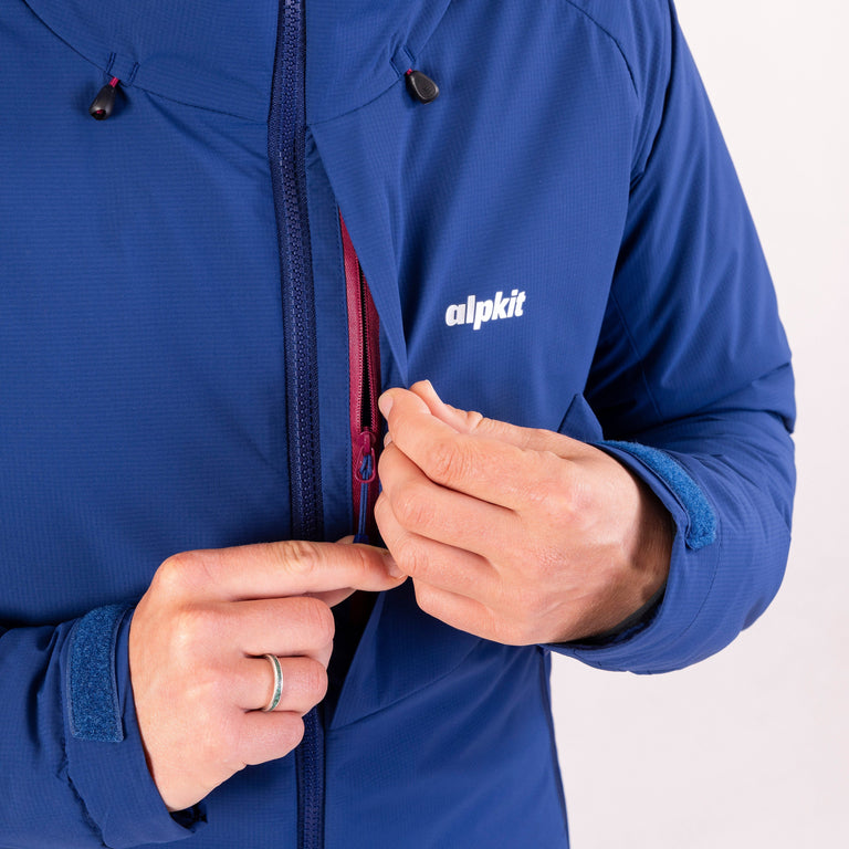 For mountaineering use we’ve included a helmet-compatible hood with a wired peak to deflect scattering spindrift and inner cuffs stop snow and draughts from creeping under gloves. The main zip is two-way for belaying ease and the sleeves have slightly less insulation than the body to allow to you swing your axes freely.