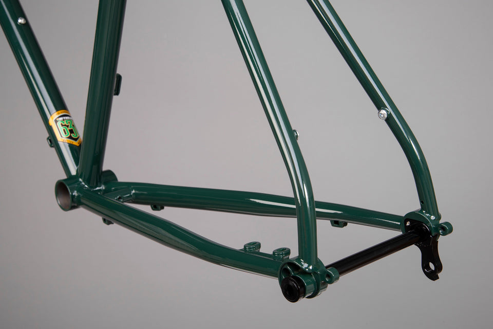 The frame is compatible with traditional 2x setups as well as more modern 1x groupsets.